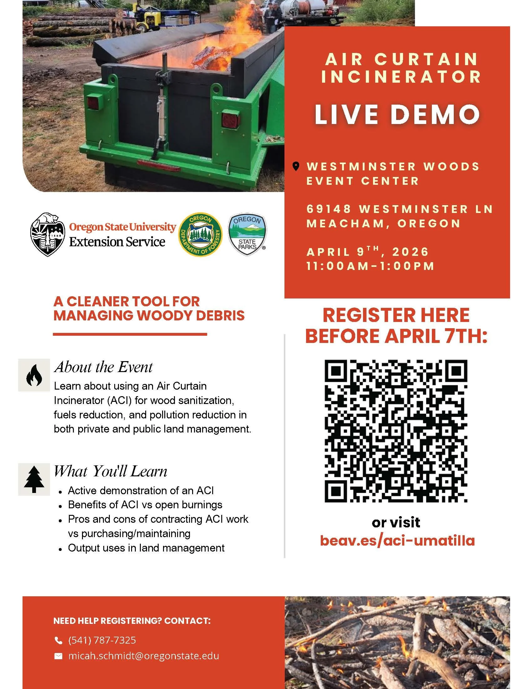 These live demos are a great chance to see how ACIs can be used for woody debris disposal, fuels reduction, and smoke reduction—while getting a feel for whether this tool might make sense for your property.